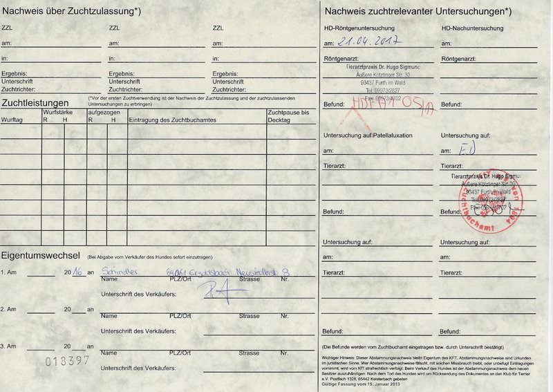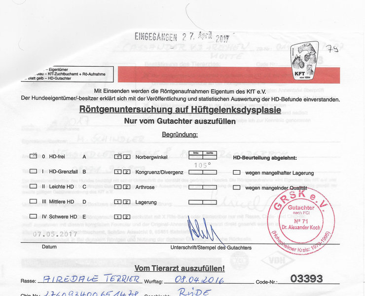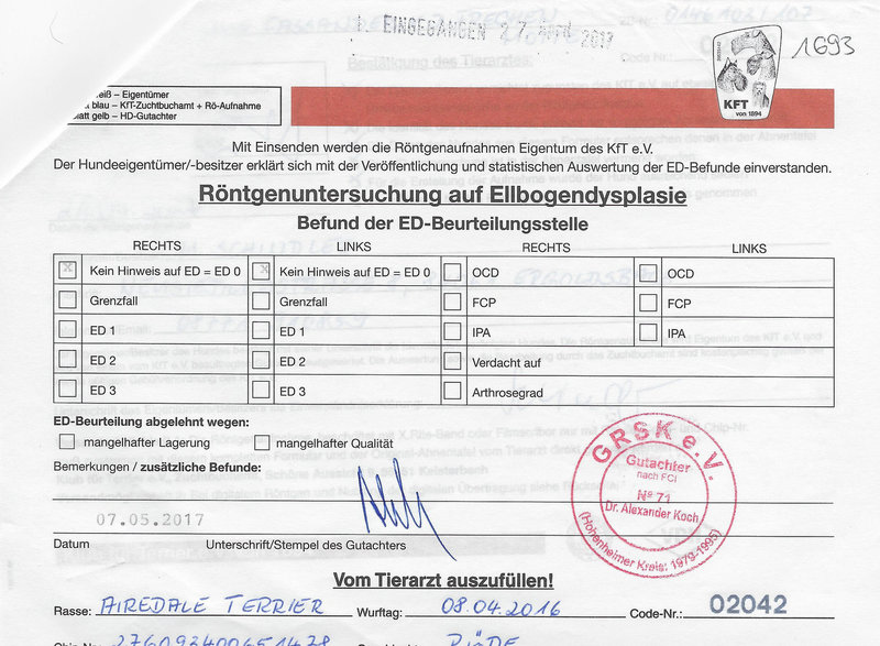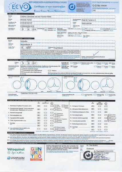 HD-A1, ED-0, Augen-frei (04.2020), DNA, Organwerte (10/2019 ) ohne Befund