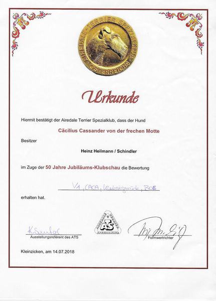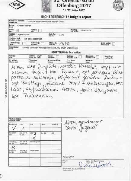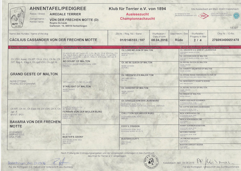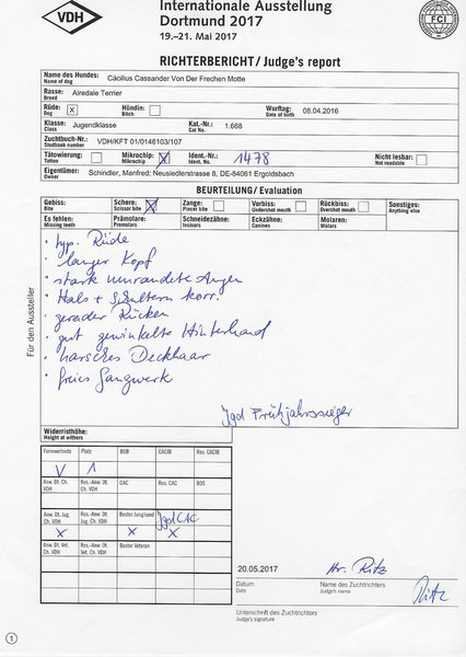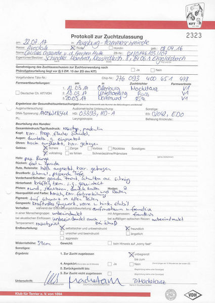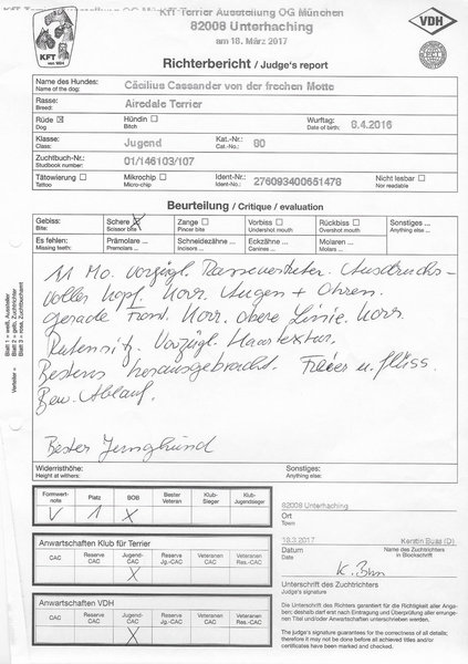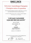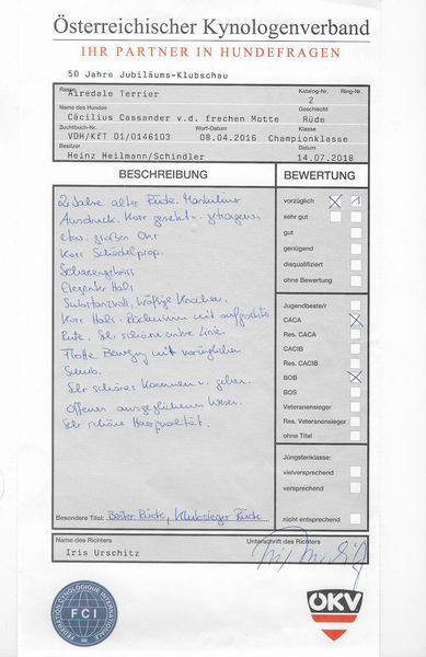 Hier finden sich alle zuchtrelevanten Unterlagen, Richterberichte und Championtitel von Cäcilius: